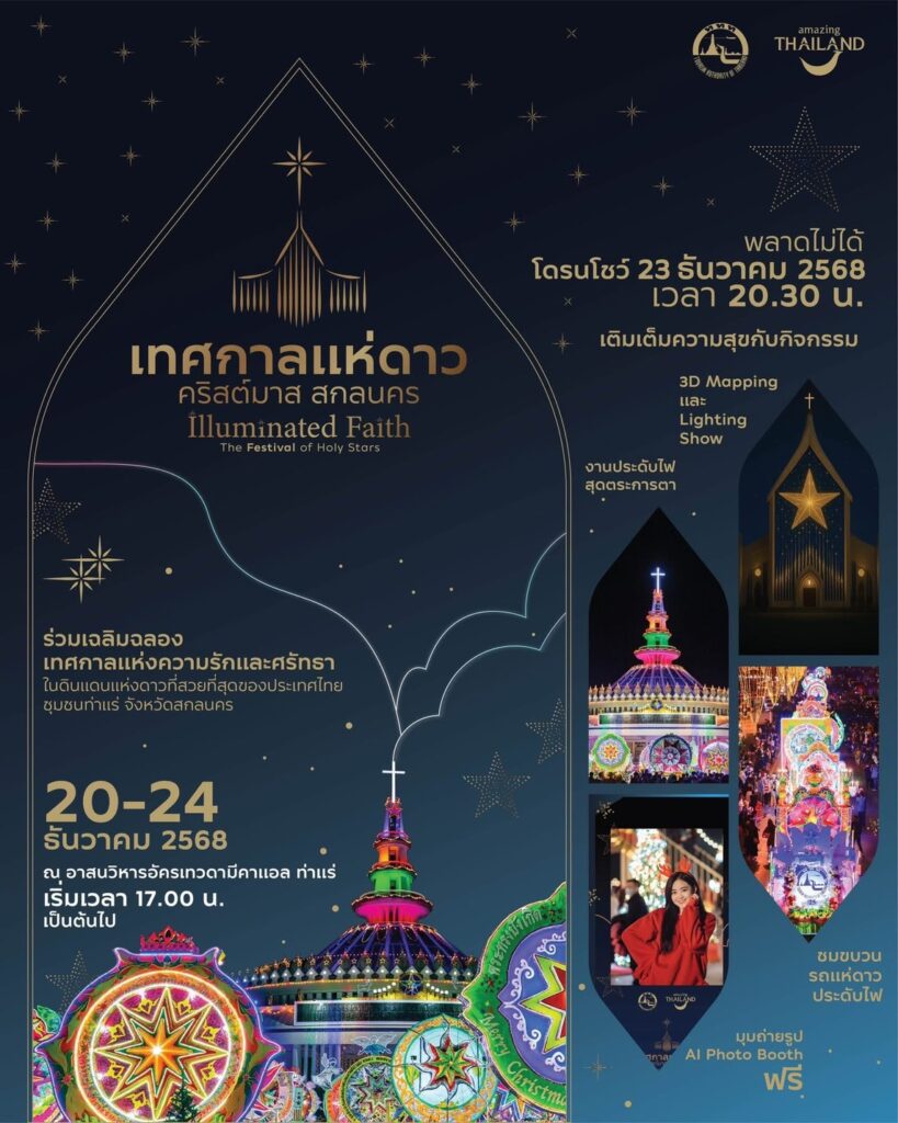 ททท. เฉลิมฉลองเทศกาลแห่งความสุขเดินหน้ากลยุทธ์ Event Marketing ผลักดัน Local Events เป็น Signature Event นำร่องด้วยงานเทศกาลแห่ดาวคริสต์มาส สกลนคร ประจำปี 2568 ประเพณีอันมีเอกลักษณ์และความสำคัญของชาวคริสต์ในพื้นที่จังหวัดสกลนคร เป็นการแสดงออกถึงความศรัทธาของชาวคริสต์ที่มีต่อพระเยซูคริสต์และเป็นการร่วมกันเฉลิมฉลองวันประสูติของพระองค์ โดยเป็นงานที่สามารถดึงดูดนักท่องเที่ยวทั้งชาวไทยและต่างชาติเข้ามาท่องเที่ยวในพื้นที่อย่างเนืองแน่น ในปีนี้จัดขึ้นบริเวณอาสนวิหารอัครเทวดามีคาแอล ตำบลท่าแร่ จังหวัดสกลนคร ภายใต้แนวคิด “Illuminated Faith: The Festival of Holy Stars” ดินแดนแห่งดวงดาว พร่างพราวความสุข ระหว่างวันที่ 20–24 ธันวาคม 2568 เวลา 17.00 น. เป็นต้นไป