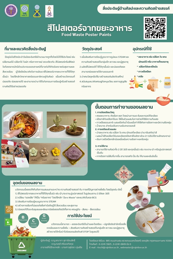 ผลงาน “สีโปสเตอร์จากขยะอาหาร” สะท้อนการบูรณาการองค์ความรู้แบบ STEAM Education ผสานศิลปะ วิทยาศาสตร์ และสิ่งแวดล้อมเข้าด้วยกันอย่างเป็นรูปธรรม สอดคล้องกับแนวคิด Zero Waste และ BCG Economy (Bio–Circular–Green Economy) ซึ่งเป็นทิศทางสำคัญของการพัฒนาอย่างยั่งยืน และเป็นเหตุผลสำคัญที่ทำให้ผลงานชิ้นนี้ได้รับการพิจารณาให้คว้ารางวัล เหรียญทอง จากเวทีการประกวดสิ่งประดิษฐ์ระดับเยาวชนในครั้งนี้