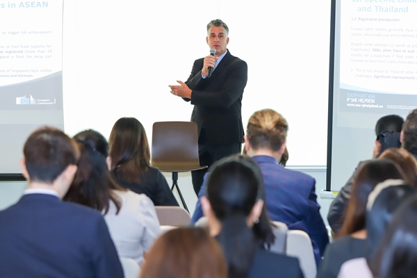 ภายหลังกล่าวต้อนรับผู้เข้าร่วมสัมมนา โดย นางภารณี อดุลยพิเชฏฐ์ ประธานสมาคมการค้ายูโรเปียนเพื่อธุรกิจและการพาณิชย์ (EABC) เป็นการแสดงปาฐกถาพิเศษโดย นางสาวพริ้วแพร ชุมรุม รองอธิบดีกรมทรัพย์สินทางปัญญา และถ้อยแถลงเกี่ยวกับความร่วมมือระหว่างสหภาพยุโรปและประเทศไทยโดย Ms. Claire Castel, IP Regional Attache for South East Asiaผู้แทนสหภาพยุโรปประจำประเทศไทย