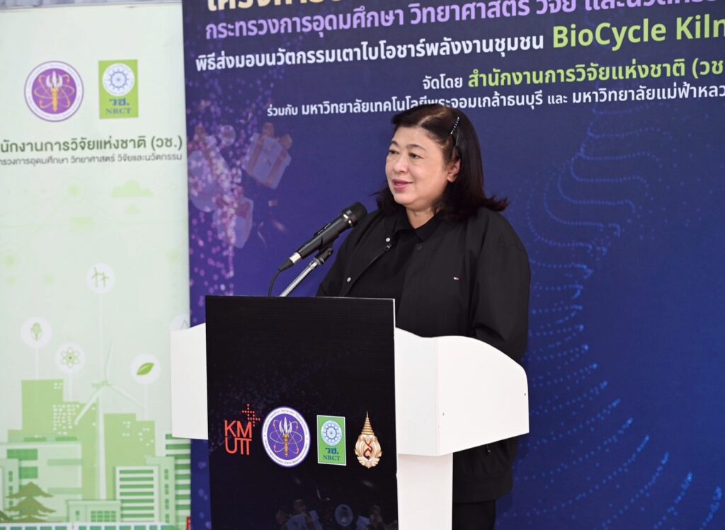 ดร.วิภารัตน์ ดีอ่อง ผู้อำนวยการสำนักงานการวิจัยแห่งชาติ กล่าวว่า นวัตกรรมเตาไบโอชาร์พลังงานชุมชน BioCycle Kiln เป็นผลงานวิจัยที่ วช. ให้การสนับสนุนทุนพัฒนา โดยคณะนักวิจัยมีความตั้งใจแก้ไขปัญหาภาคเกษตรกรรมควบคู่กับการดูแลสิ่งแวดล้อม นวัตกรรมดังกล่าวมุ่งจัดการเศษวัสดุเหลือใช้ทางการเกษตรด้วยกระบวนการแปรรูปเป็นไบโอชาร์ เพื่อนำไปปรับปรุงคุณภาพดิน ลดต้นทุนการผลิต และเพิ่มมูลค่าทางเศรษฐกิจให้แก่เกษตรกร ขณะเดียวกันยังช่วยลดการเผาในที่โล่ง ซึ่งเป็นหนึ่งในสาเหตุสำคัญของปัญหาฝุ่นละออง PM2.5 และผลกระทบต่อสุขภาพของประชาชน