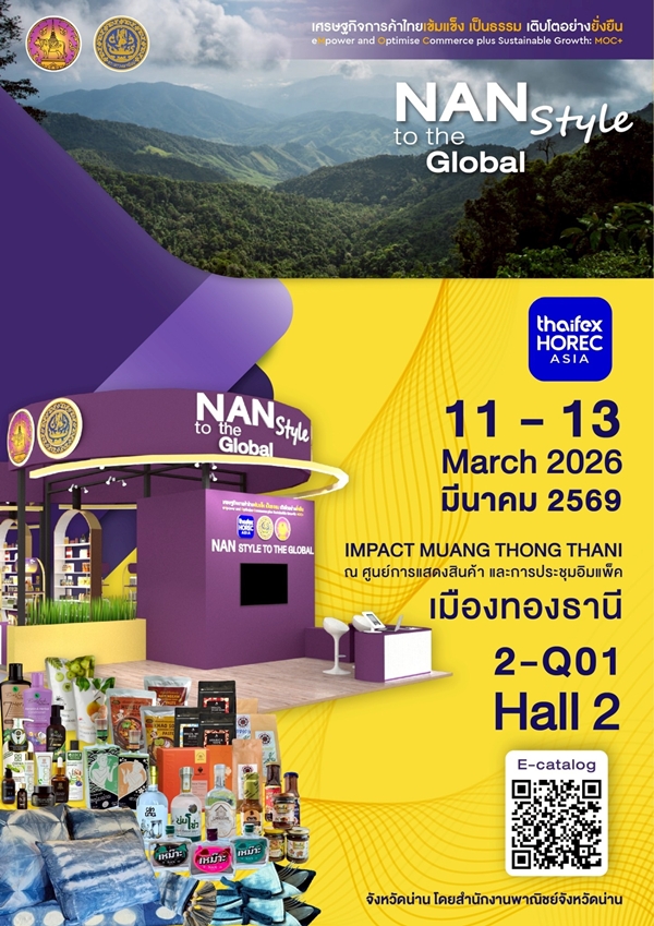 เตรียมพบกับงาน “Nan Style To The Global” ระหว่างวันที่ 11 – 13 มีนาคม 2569 ตั้งแต่เวลา 10.00 – 18.00 น. ณ อาคาร Impact Challenger 2 (เลขที่บูธ 2-Q01) ศูนย์แสดงสินค้าและการประชุมอิมแพ็ค เมืองทองธานี อำเภอปากเกร็ด จังหวัดนนทบุรี
