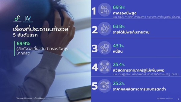 ค่าครองชีพ–รายได้–หนี้สิน ประเด็นหลักที่ประชาชนกังวล :ประชาชนตัวอย่างร้อยละ 69.9 มีความกังวลเกี่ยวกับค่าครองชีพสูงมากที่สุด รองลงมา เช่น รายได้ไม่พอกับรายจ่าย (ร้อยละ 63.8) หนี้สิน (ร้อยละ 43.1) สวัสดิการจากภาครัฐไม่เพียงพอ (ร้อยละ 25.4) และราคาผลผลิตทางการเกษตรตกต่ำ (ร้อยละ 25.2) เป็นต้น