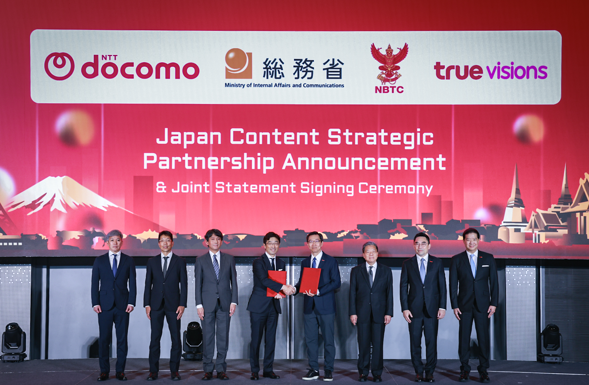 เอ็นทีที โดโคโม โดยนายทาเคชิ ไซโต้ รองประธานบริหาร บริษัทเอ็นทีที โดโคโม และทรู คอร์ปอเรชั่น โดยนายองอาจ ประภากมล หัวหน้าสายงานทรูวิชั่นส์ และมีเดีย บมจ. ทรู คอร์ปอเรชั่น ร่วมลงนามบันทึกข้อตกลงความร่วมมือเชิงยุทธศาสตร์ระดับชาติ “Japan Content Strategic Partnership Announcement & Joint Statement” ภายใต้นโยบาย “New Cool Japan Strategy” เพื่อยกระดับไทยสู่การเป็นศูนย์กลางคอนเทนต์ญี่ปุ่นในภูมิภาคอาเซียน ผ่านแพลตฟอร์ม TrueVisions Now โดยมีผู้บริหารระดับสูงจากองค์กรพันธมิตรชั้นนำทั้งภาครัฐและเอกชนของญี่ปุ่นและประเทศไทย ได้แก่ นายโนบุโอะ คิริยามะ อธิบดีด้านกิจการระหว่างประเทศ สำนักยุทธศาสตร์ระดับโลก กระทรวงกิจการภายในประเทศและการสื่อสารของประเทศญี่ปุ่น นายโทรุ คะจิวาระ อัครราชทูตและหัวหน้าฝ่ายเศรษฐกิจ สถานเอกอัครราชทูตประเทศญี่ปุ่น ประจำประเทศไทย นายโทโมโนริ ทานะกะ ผู้จัดการทั่วไป สายงานธุรกิจสตรีมมิ่ง บริษัทเอ็นทีที โดโคโม ศาสตราจารย์คลินิก นายแพทย์สรณ บุญใบชัยพฤกษ์ ประธานกรรมการ คณะกรรมการกิจการกระจายเสียง กิจการโทรทัศน์ และกิจการโทรคมนาคมแห่งชาติ (กสทช.) นายขจร เจียรวนนท์ กรรมการ บริษัท ทรูวิชั่นส์ กรุ๊ป จำกัด และนายพีรธน เกษมศรี ณ อยุธยา หัวหน้าคณะผู้บริหารด้านคอนเทนต์และมีเดีย บมจ. ทรู คอร์ปอเรชั่น ให้เกียรติร่วมเป็นสักขีพยาน ณ แกรนด์ ฮอลล์ ทรู ดิจิทัล พาร์ค (ฝั่งเวสต์)