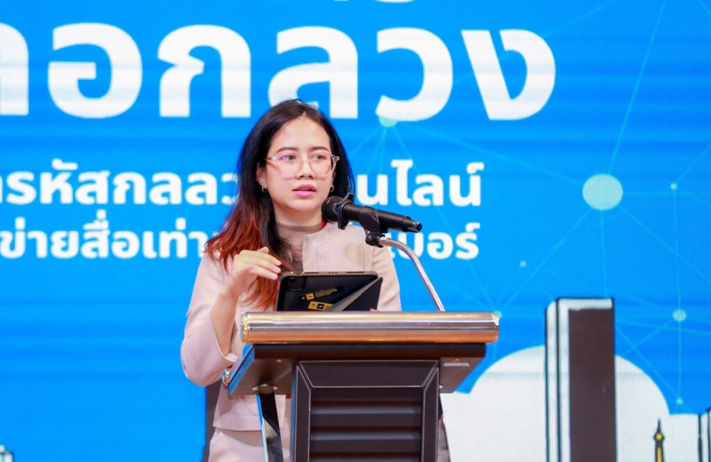 พัชรพร พงษ์ทัดศิริกุล ผู้อำนวยการฝ่ายส่งเสริมการรู้เท่าทันและเฝ้าระวังสื่อ กองทุนพัฒนาสื่อปลอดภัยและสร้างสรรค์ ได้ให้เกียรติกล่าวเปิดงาน กล่าวว่า “โครงการนี้เป็นตัวอย่างที่ดีของการนำองค์ความรู้จากหลากหลายสาขามาประยุกต์ใช้ร่วมกัน ไม่ว่าจะเป็นด้านสื่อสารมวลชน จิตวิทยา สุขภาพและการวิจัยเชิงพฤติกรรม เพื่อสร้างความเข้าใจให้กับสังคมในประเด็นที่มีความซับซ้อน เพราะการป้องกันภัยรูปแบบนี้จึงมิใช่เพียงการเตือนภัยเกี่ยวกับกลโกงเท่านั้น แต่จำเป็นต้องช่วยให้ประชาชนเข้าใจว่า การหลอกลวงทำอย่างไรในเชิงจิตวิทยา และเราจะสามารถสร้างภูมิคุ้มกันทางความคิดและการตัดสินใจได้อย่างไร และยังสะท้อนให้เห็นถึงการรวมตัวของผู้มีบทบาทจากหลายภาคส่วน ทั้งสื่อมวลชน นักวิชาการ ภาคประชาสังคม หน่วยงานภาครัฐ และองค์กรระหว่างประเทศ ซึ่งล้วนมีบทบาทสำคัญในการเสริมสร้างความรู้เท่าทันภัยไซเบอร์ให้กับสังคม”